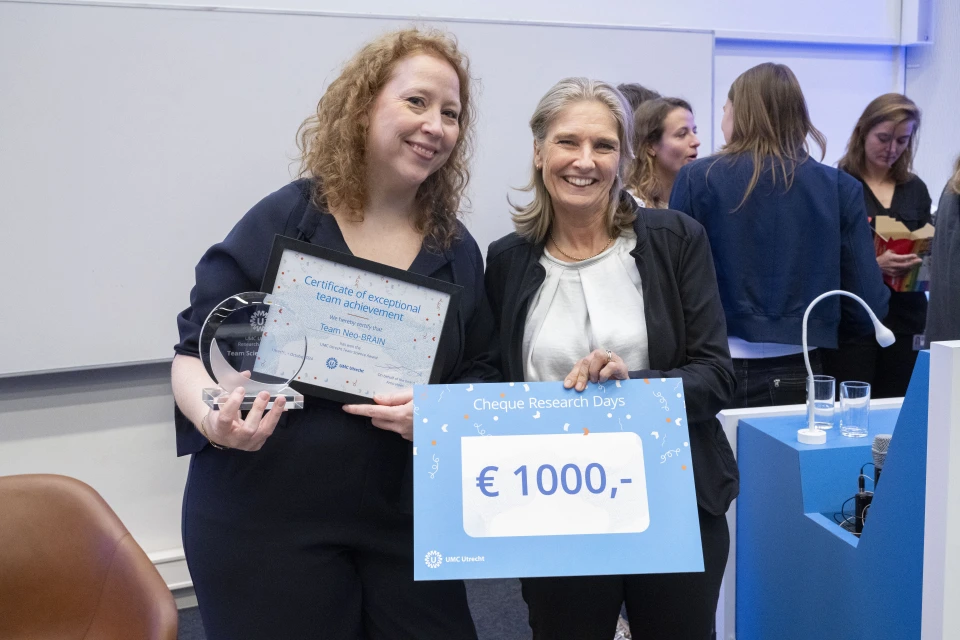 Team Neo-BRAIN has received the second UMC Utrecht Team Science Award for interdisciplinary research. Manon Benders and Cora Nijboer received the prize, consisting of €1,000, a certificate and, of course, eternal glory, on behalf of the team. The prize was presented by vice dean Prof. Elly Hol during a special award ceremony on Oct. 3 as part of the UMC Utrecht Research Days.