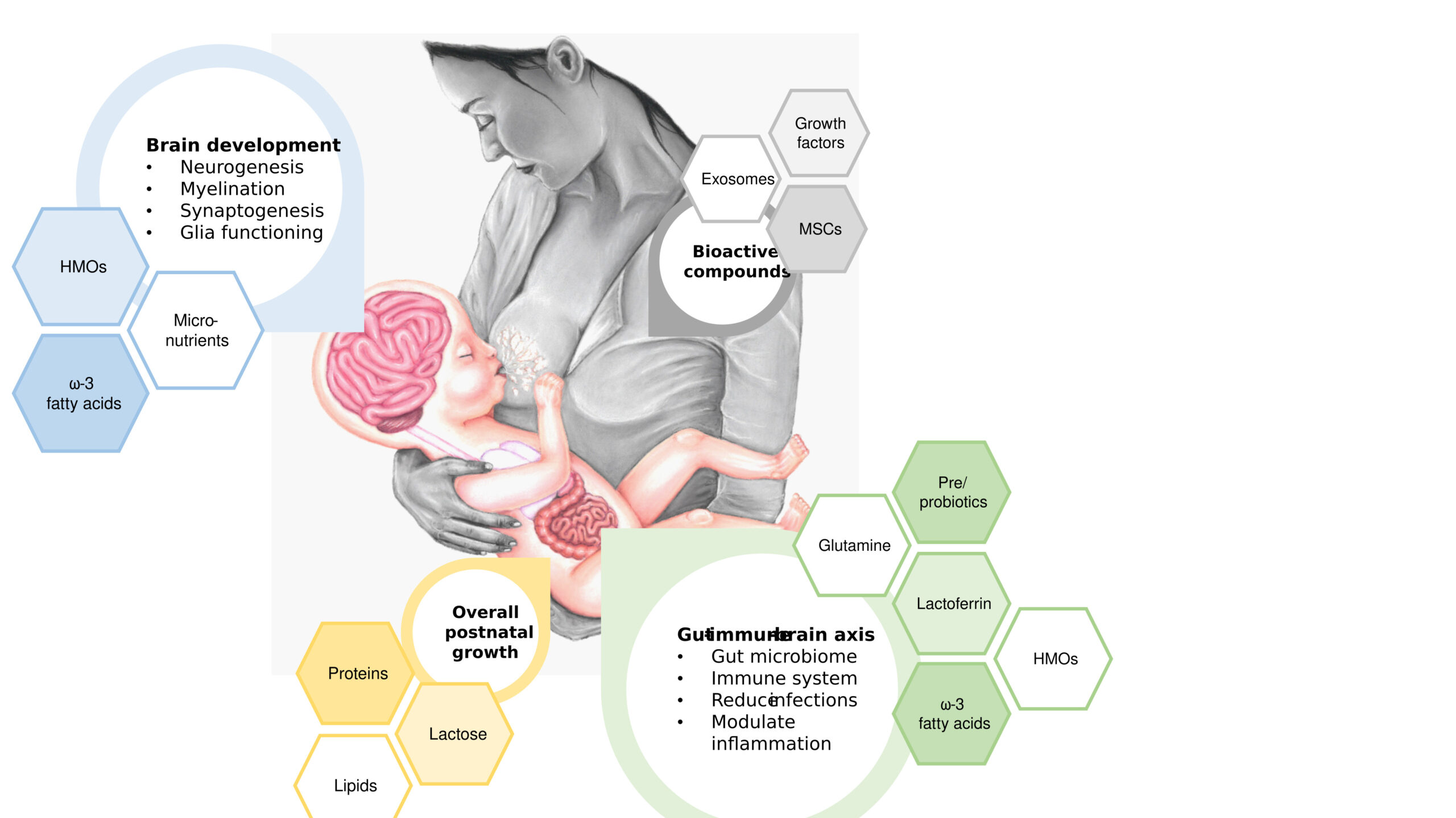 IIn particular, we investigate the neuroprotective effects of human milk components for preterm infants, with a specific focus on human milk oligosaccharides (HMOs). HMOs are the third most component of human milk and play an important role in infant health by supporting gut microbiota and immune system development. By taking a bench-to-bedside approach, we study the potential association between HMOs intake and neurodevelopment in preterm infants and in animal models for preterm brain injury. We investigate whether and how HMOs supplementation can reduce preterm brain injury.
