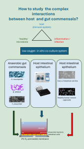 To achieve this, we aim to optimize in vitro host-microbiota models that enable the co-culture of anaerobic gut bacteria with different human cells mimicking physiologically relevant conditions, with a focus on oxygen levels and mucus production. With this model, commensal strains will be extensively examined to further unravel the complex interactions between the host and gut commensals.