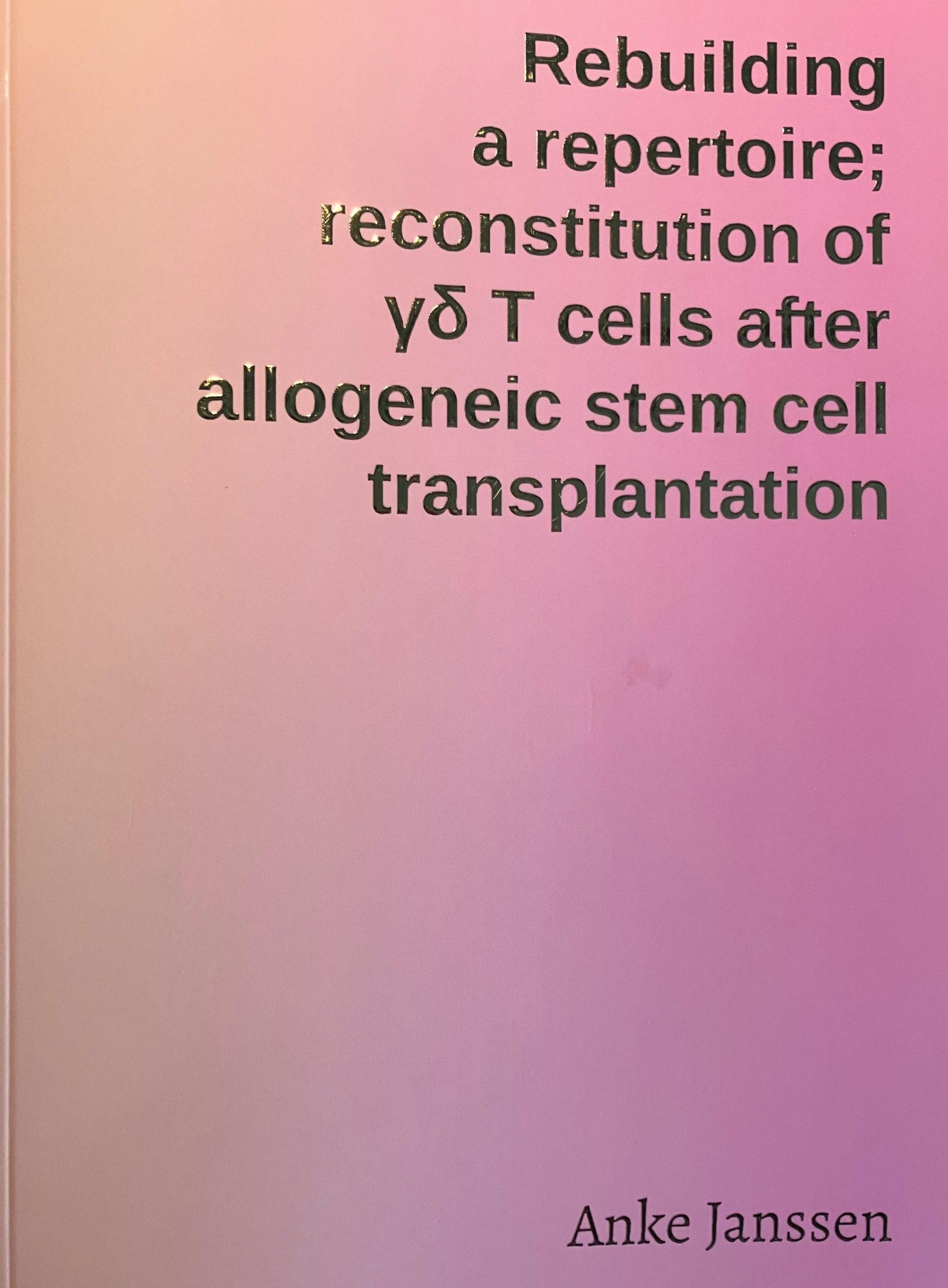 γδ T cells are among the first immune cells to recover after a donor stem cell transplantation (SCT). SCT still remains the only curative treatment for various hematological malignancies, but is often complicated by infections, relapses and graft versus host disease (GVHD), a severe inflammatory reaction in organs of the recipient. T cells play a crucial role in both the efficacy of the treatment as well as the severe complications such as GVHD. Whereas αβ T cells are extensively studied after SCT, the role of γδ T cells is less clear. In the PhD thesis by Anke Janssen, MD (Department of Hematology and Center for Translational Immunology, UMC Utrecht) the role of γδ T cells after SCT is explored and their potential for therapeutic interventions is investigated.
