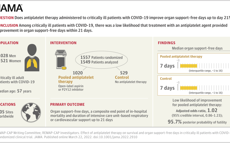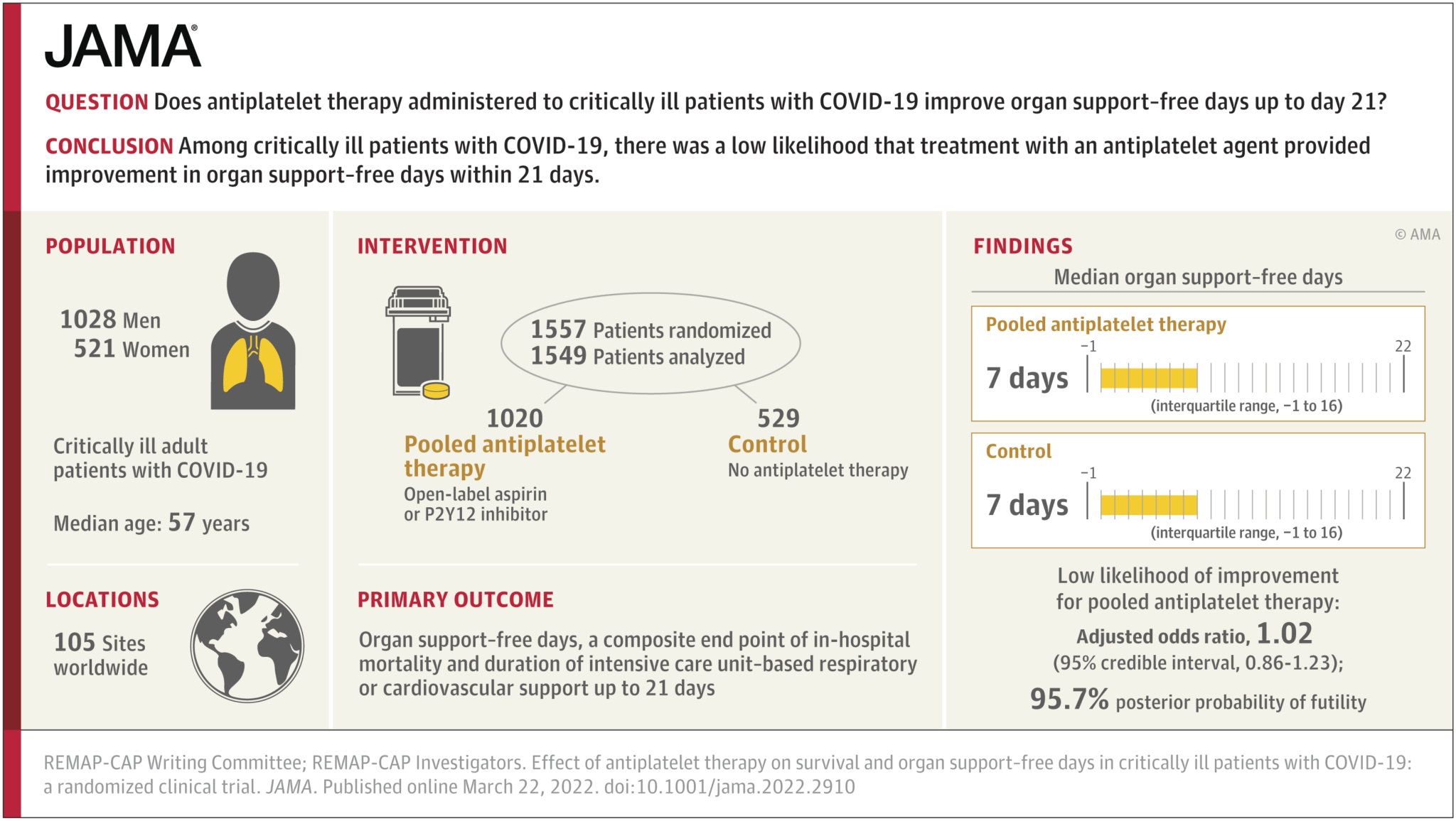 REMAP-CAP Writing Committee for the REMAP-CAP Investigators. Effect of Antiplatelet Therapy on Survival and Organ Support–Free Days in Critically Ill Patients With COVID-19- A Randomized Clinical Trial. JAMA, Published Online March 22, 2022