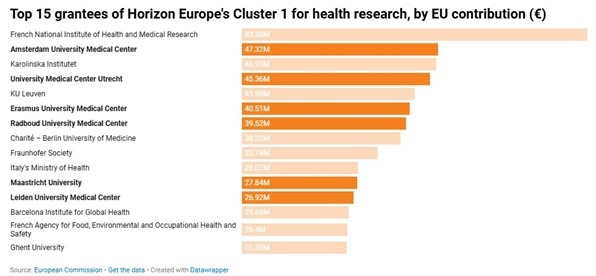 Dutch medical universities are leading the way in Horizon Europe-funded health research, with six of them making it to the top 15 grantee list. UMC Utrecht secured the 4th spot with an accumulation of grants exceeding €45 million since 2021. Together, these Dutch universities have participated in projects 250 times and attracted €227 million in funding from Horizon Europe’s cluster focused on health research and innovation. That’s out of €4.7 billion that the EU has invested in collaborative health research in this period.