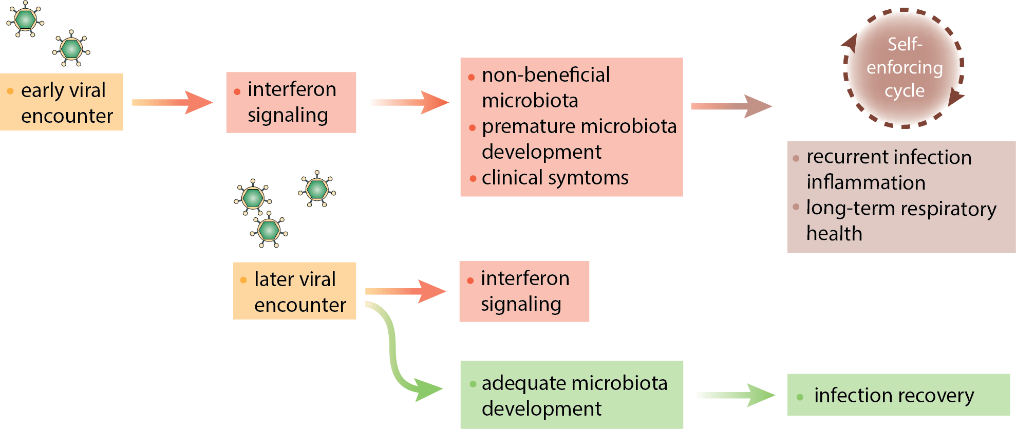 By combining multiple datasets, the researchers provide support for the hypothesis that first viral encounters trigger an interferon-associated pro-inflammatory environment, which selects for specific pathobionts that further drive airway inflammation and symptomatology in a self-enforcing positive feedback loop. This pro-inflammatory and microbiologically perturbed environment in turn renders an individual more vulnerable to recurrent (viral) RTIs.