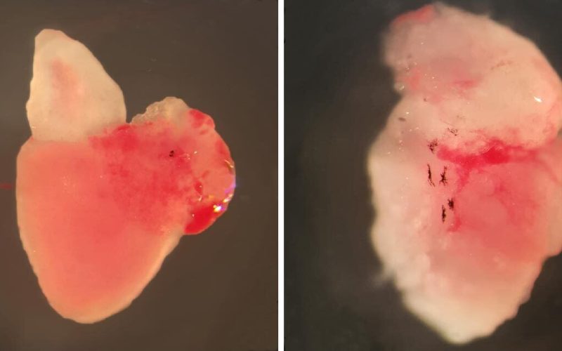 Image showing a healthy adult zebrafish heart (left) and PLN p.Arg14del adult zebrafish heart with arrhythmogenic cardiomyopathy (right). Credit: Sarah Kamel, copyright: Hubrecht Institute.