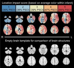 Using the vulnerability map, a diagnostic tool for use in the clinic was then developed. This so-called “location impact score” predicts the risk of cognitive impairment (PSCI – post stroke cognitive impairment) in five grades, see image. Geert Jan: “The map shows in which areas of the brain infarcts are associated with a high risk of cognitive impairment and in which areas with a lower risk. By projecting the brain scan of individual patients over the map, their risk can already be predicted immediately after the stroke. This can be done as early as the emergency room.”