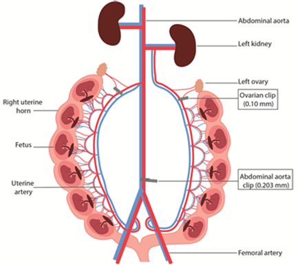 The Reduced Uterine Perfusion Pressure (RUPP) model is developed at the University of Mississippi Medical Center, where two of our researchers (Caren van Kammen and Fieke Terstappen) were taught the animal model. They have now successfully continued their work at the UMC Utrecht. In this animal model, blood flow towards the uterus and placenta is reduced by ~40% by placing vascular clips, resulting in fetal growth restriction. (Figure 1). Currently, we are the only center in Europe with this valuable model. In the upcoming year we will study among others the development of cardiovascular, renal and neurological disorders in the fetal growth restricted offspring. One of the most important follow-up steps entails testing potential and promising therapeutic strategies to prevent these long-term non-communicable disorders at a multi-organ level. In addition, we aim to evaluate new imaging techniques (oxygenation measurements using MRI and ultrasound) to improve fetal monitoring.