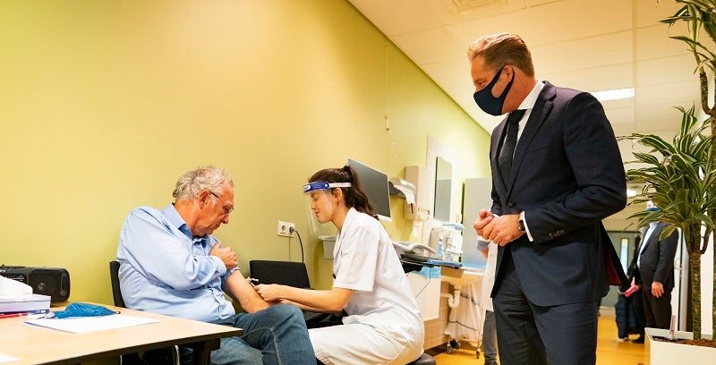 Investigator Eva Koekenbier, MD vaccinates a participant in the BCG-PRIME study. Hugo de Jonge, at that time Minister of Health, Welfare and Sports, watches with interest (UMC Utrecht, December 2020)