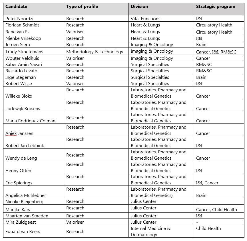The new associate professors within UMC Utrecht consist of 25 colleagues (eleven women and fourteen men) from seven divisions and six strategic programs (see table).
