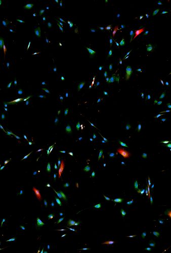 Shown: A group of senescent cells (RPE1). Note that there are substantial differences between these, making it important to develop drugs to selectively target specific subsets. We develop such subtype-specific compounds, e.g. against “scarred” senescent cells. Legend: DNA (blue), MMP3 (red), IL1-β (green) Data by Dr. Peter de Keizer and Dr. Johannes Lehmann