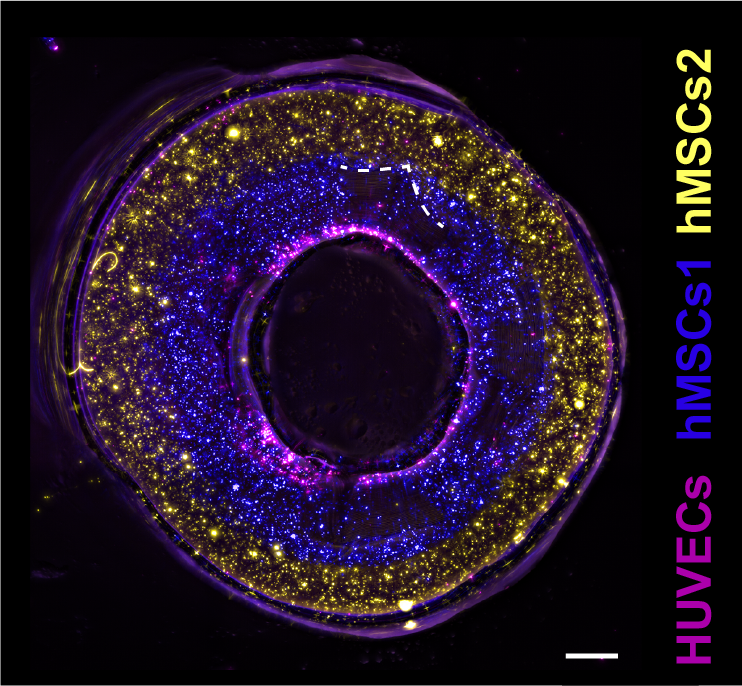 Volumetric bioprinting, with which an object a few centimeters in size can be printed in mere seconds, offers many possibilities for the printing of cells. The speed of the process combined with the cell-friendliness of the gel are great advantages. However, when the print is finished, the cells may not be placed exactly where they are needed, nor is it possible to alter the gel much to aid the development, growth or specialization of cells to create functional tissues. Overcoming this hurdle, then, is important, because in our body cells know where to go and where to stay following signals that they sense in specific regions or tissues.